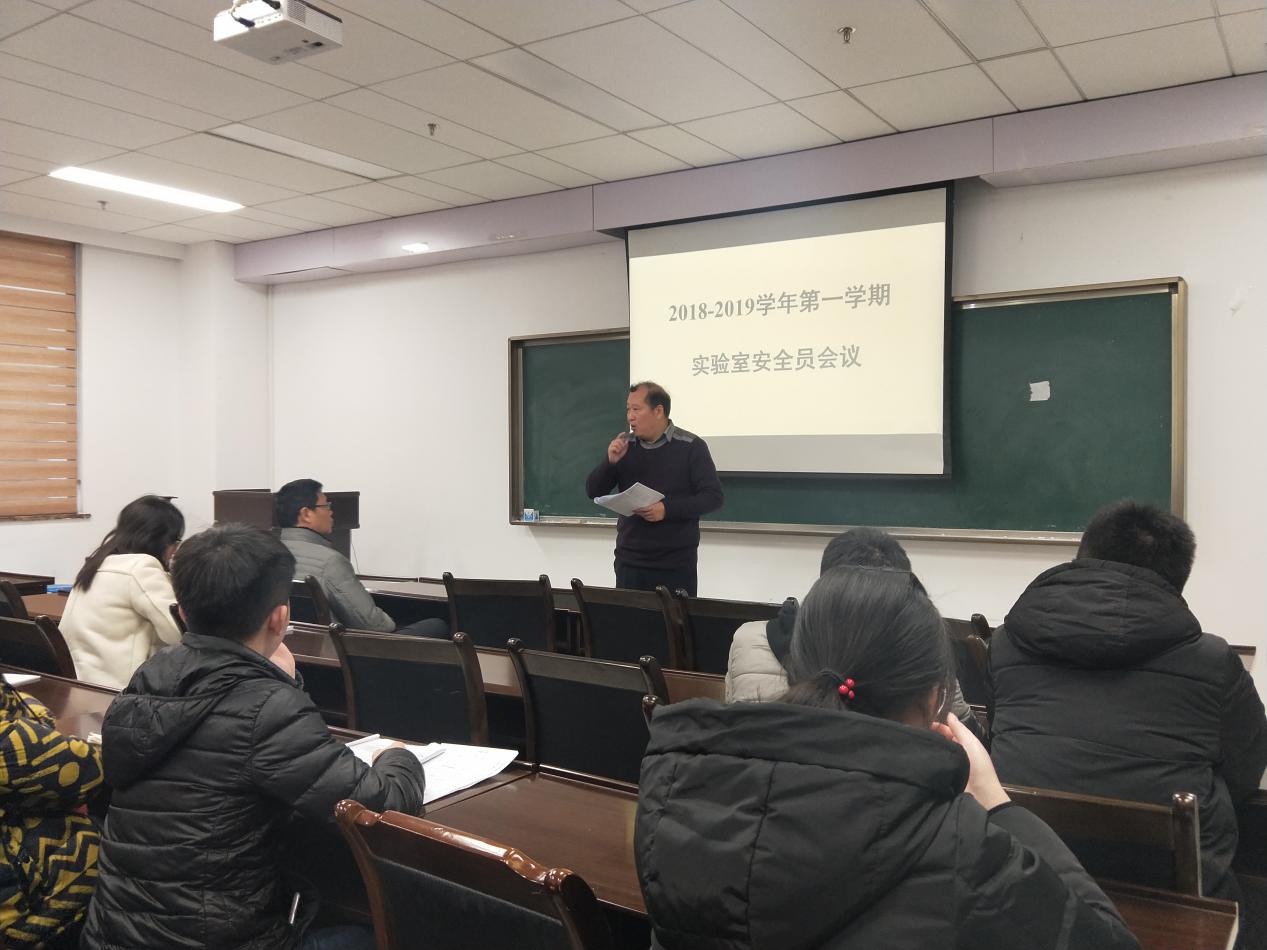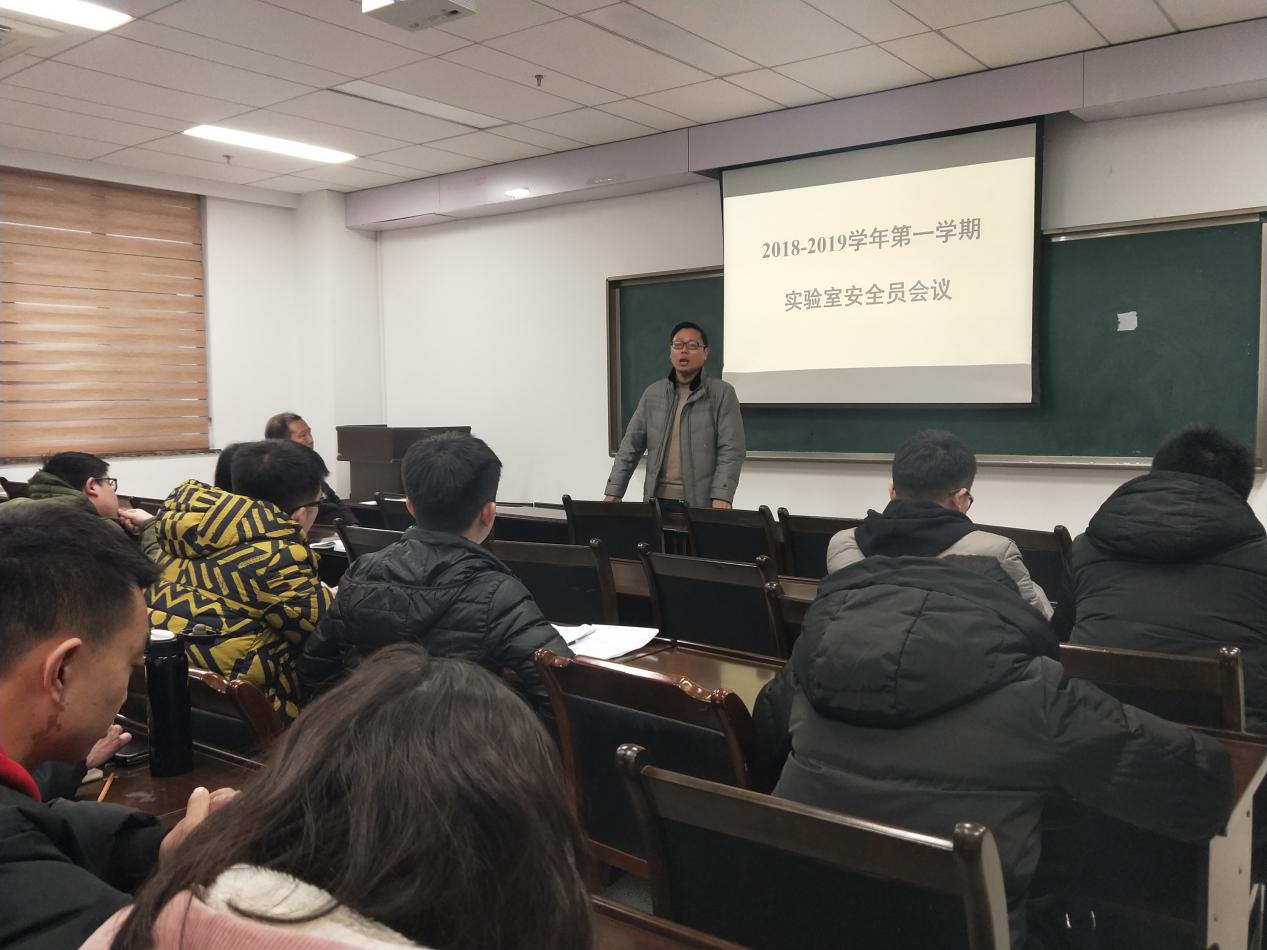 会上,陶老师首先简单总结了2018年学院实验室技术安全工作情况。2018年,学院在制度建设、责任落实、安全教育、实验室设施设备完善、安全检查、废物处置和过期化学品处置等方面做了大量工作。包括:学院安全工作第一责任人与各实验室安全责任人签订了安全责任书;为本科新生首次开设《化学实验室技术安全》必修课;组织新生进行消防演练、安全知识竞赛等等。学院尤其注意实验室日常安全隐患的排查及整改工作,努力查找隐患点并当即消除,无力当即消除的隐患报告学校相关部门寻求帮助。在全院大会及年级大会上,对师生员工安全警钟长鸣,不断强化师生安全意识,将安全渗透到每一位师生员工的工作、学习当中。然后,陶老师通报近期收到的教育部、重庆市及学校的安全工作通知,并说明各实验室在填报金属粉末存量统计表及成人AI