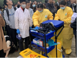 救援人员由《化学实验室技术安全》任课教师陶熊新与李雪敏两位老师担任,两位老师在接到应救援指令后,第一时间穿戴好个人防护用品到达现场。救援人员陶老师先与谭老师确认事故地点,实验室状况,人员伤亡情况等信息,随后在实验室门口用气体探测器检测实验室空气污染情况,确认安全后与李老师一同进入实验室进行泄漏品浓硫酸的处理。经过化学吸油条围堵,吸附枕吸附,吸附棉片二次吸附,中和剂中和,检测泄漏点PH值等等一系列应急操作,对泄漏地浓硫酸进行了应急回收处理,最后确认事发环境空气质量达标后,撤出实验室。这一系列应急处理过程通过应急指导人员的旁白圆满的呈现在同学们的眼前。