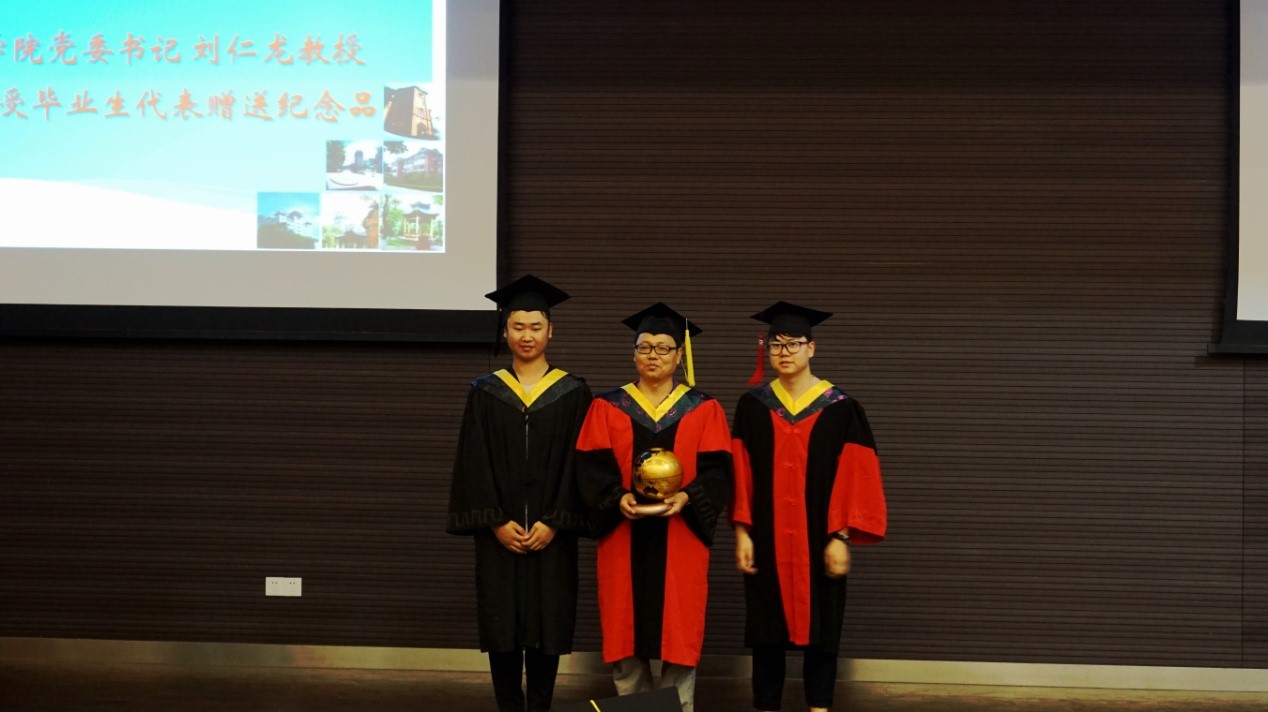 接着,学院党委书记刘仁龙教授代表学院接受毕业生代表赠送纪念品。经师易遇,人师难遇。2018届所有毕业生感谢学院老师们躬亲授受,旋转乾坤,引导学生感受世界的多姿多彩,也祝福学院和母校桃李满天下,梓楠遍五洲!