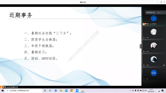 随着暑假的临近,暑期活动也随之到来。在讲解完专业分流的相关事务后,辅导员就近期事务进行了布置与介绍,主要内容有:暑假社会实践“三下乡”、团委学生会换届、年级干部换届、暑期实习、国创以及SRTP实践。在会上,辅导员鼓励我们积极参加暑期活动,锻炼自身综合能力、提高社会实践经验。