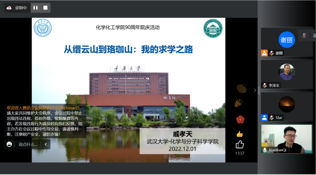 建院90周年,更好地发挥优秀校友在学生成长成才过程中的榜样引领作用,激发学生逐梦激情,我院策划并组织了“锦绣华章”校友分享会系列活动。12月1日上午10点,我院优秀校友戚孝天带来了《从缙云山到珞珈山:我的求学之路》的经历分享。党委副书记李泽全、部分校友、部分老师、本硕博各年级150余名学生一起参与了此次分享会。分享会由学办主任谢丽主持。