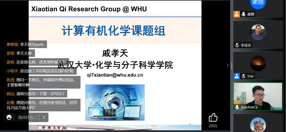 分享会上,戚孝天首先表达了对学院的深厚感情,对学院90周年华诞致以最真切的祝福。随后他对其在学院从本科到博士期间的美好学习时光、在美国匹兹堡大学的博士后工作经历、在武汉大学开展的科研探索进行讲述,他鼓励同学们对于学习、生活都要满怀热情,积极对待每一件事;树立清晰的目标,努力为之奋斗,创造属于自己的校友生活。交流环节中,同学们积极踊跃提问发言,在科研开展、出国留学、论文写作、学科发展、问题探索等多方面进行了交流。戚孝天结合自身经历,将他的理解娓娓道来。很多时候,由于各种原因,处于当下的我们对于行动的抉择感受“步步难”,时过境迁后,回顾过去经历,原来尽是“步步佳”,要相信广阔天地,大有可为。