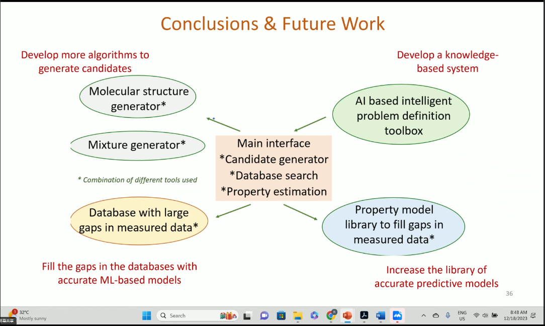 Rafiqul Gani教授的报告中总结了化工产品设计的设计理念,不论是分子产品设计、混合物设计或是设备和功能产品设计,在所有情况下,都制定了一组所需的属性,并确定了与它们匹配的候选属性。所以计算机辅助框架需要定义问题、选择表示系统、生成并测试解决问题的方案并进行选择和验证。