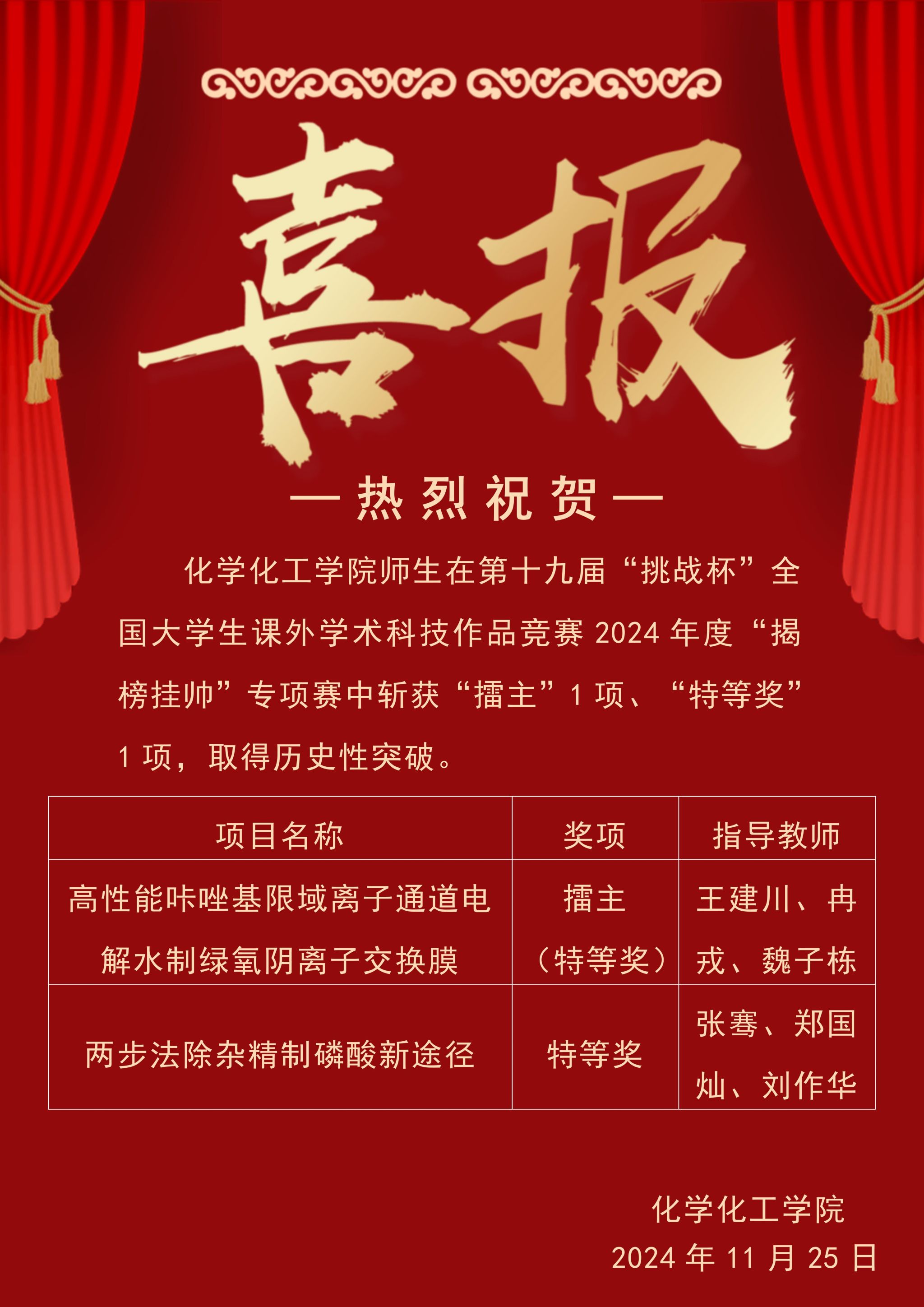 热烈祝贺我院师生在第十九届“挑战杯”全国大学生课外学术科技作品竞赛2024年度“揭榜挂帅”专项赛中斩获佳绩