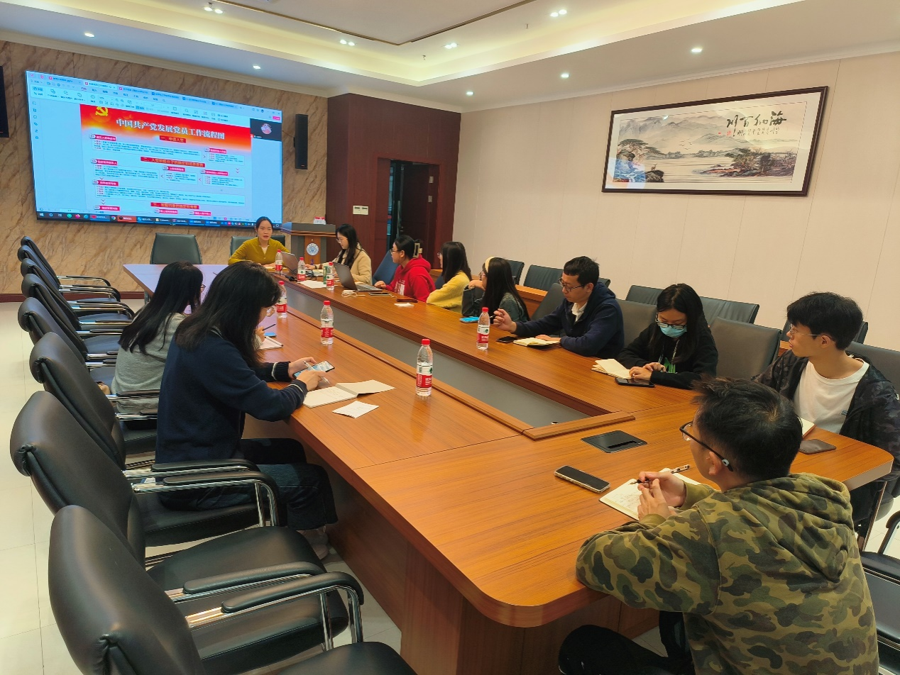 党委组织员何巧艺肯定了各研究生党支部书记的前期工作,近期党员发展工作顺利进行,此外还对党支部工作提出以下要求。首先,严格按照党员发展的程序,确保党员发展质量,提高党员的党性修养;其次,在发展积极分子过程中,对于申请人和团支部择优推荐的对象,要经常找其谈话,及时确定1-2名党员负责培养;最后,有序开展发展对象阶段工作,注意列入发展计划的对象须是培养考察一年以上,政历清楚,基本符合党员条件的入党积极分子,择优发展并须经支委会讨论通过。