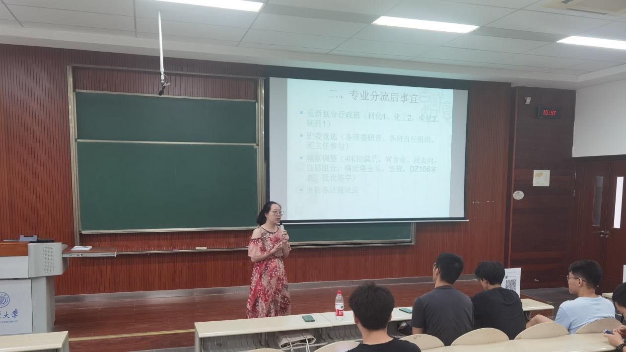 本次会议包含大类分流后相关事宜、大学生生涯规划以及暑期安全等多个内容。目前专业分流已经结束,各行政班级面临重组、班委改选提上日程。伍老师希望同学们积极参与班委竞选和选举,各班同学一起努力,建设积极向上、团结友爱、齐头并进的优秀班级。