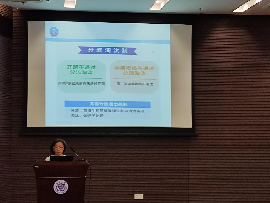 接下来,研究生教务老师罗平解读了相关文件,包括《研究生培养手册》、《研究生考核管理办法》、《研究生奖助体系》等,详细说明了研究生的学制、培养方式、考核方式、奖助政策等内容,重点强调了研究生培养过程中的几个重要环节,包括选题报告、中期考核、开题报告、论文答辩等,并要求同学们认真阅读相关文件,按时完成个人培养计划。教务老师刘姗则补充了研究生新生退选课方面的具体事宜,提醒同学们要注意毕业学分要求和课程考核方式。
