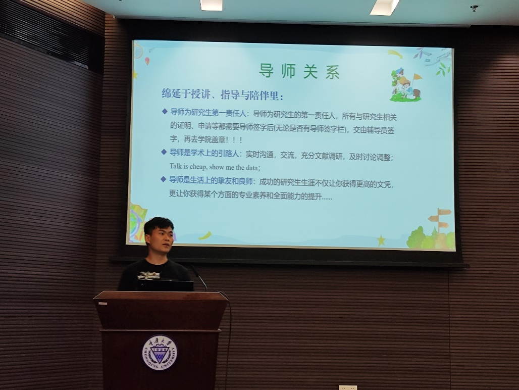 紧接着,2023级研究生兼职辅导员马侑才分享了导师关系、学生日常管理、近期事宜安排等各方面的内容,就学术创新、个人发展和身体健康等做了详细补充,殷切希望同学们能力争对学科做出原创和实质性的贡献,展示高级别的研究技能和对提升学术价值的承诺,强调了导师不仅为研究生的第一责任人、学术上的引路人,更是生活上的挚友和良师,要及时同导师沟通和交流,与导师建立良好的合作关系,此外,温馨提示同学们要坚持体育锻炼、及时关注群消息等。