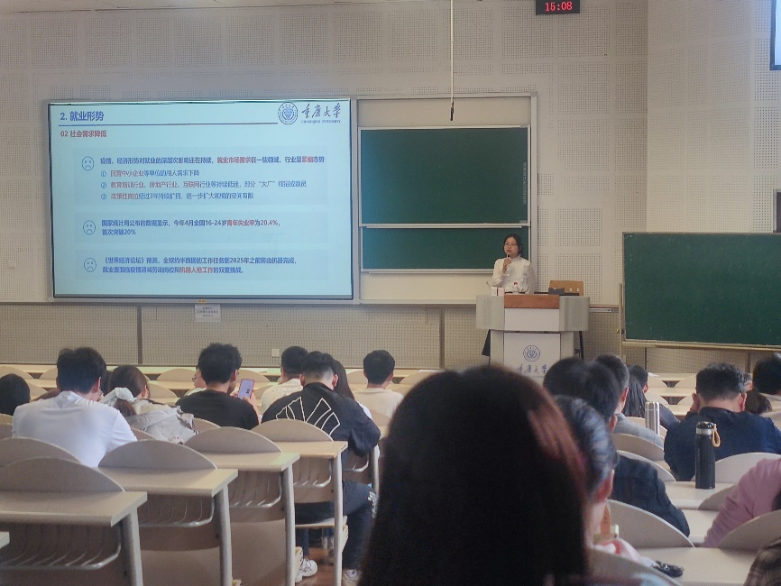 谢丽老师围绕就业形势、就业政策进行了分析解读,就毕业生关心的签约流程等问题进行了详细讲解并给出了具体建议。谢老师指出,毕业生应该有清晰地自我定位,避免盲目跟风,要积极转变就业观念,主动出击。不要因为身边人考公就跟着考公,认清自身情况把握自身节奏才是最有效的。此外,谢老师介绍了毕业生就业信息网,提醒应届毕业生们要熟悉就业宣传渠道,积极关注多个渠道的就业信息。她同时介绍了基本的电子签约流程,学校就业指导中心各类服务工作。